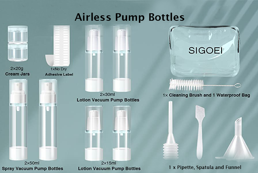 These airless pump bottles are your best solution for cosmetics around town, country, or sea. This set comes with both spray (liquid) and pump (lotion) tops for the bottles. The bottles are offered in 3 different sizes, including 2 1.7 oz (50 ml), 2 1 oz (30 ml) and 2 1/2 oz (15 ml) bottles. The bottles come with tops attached, but you can switch them around to suit your spray or lotion needs. Also included in the set are 2 cream bottles (unfortunately, not airless pump), as well as a cleaning brush, spatula, funnel, and pipette (for drawing up liquids from one bottle and squeezing it into the travel bottle).