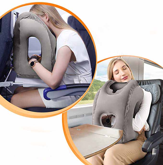 This new-fangled travel pillow is a brilliant design for upright sleeping. It allows your arms to slip inside the pillow for stabilization, while also offering an air hole for those who wish to sleep without turning their head. By laying across the pillow your body can relax, allowing greater comfort and steady sleep.